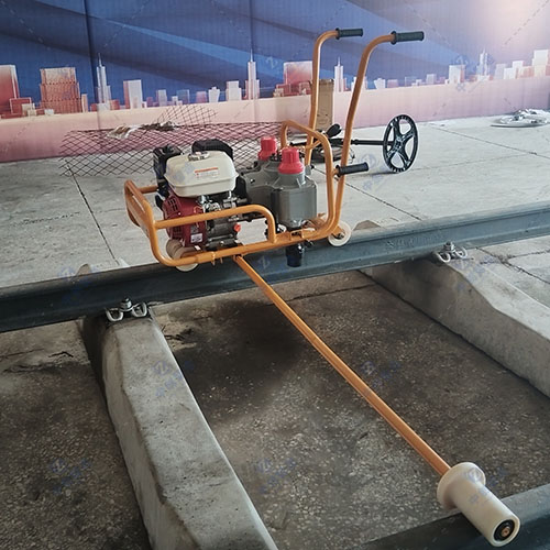 3、将扳手抬上钢轨,使前后轨行轮卡住钢轨,根据轨型调整后轨行轮高度。