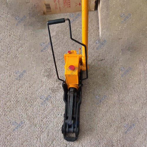 2、适当清理轨下道碴,将机具从钢轨的一侧穿入轨下。如要拨道需将支杆的凸起部分卡在轨底一侧。向上关闭卸荷阀,前后摆动手搬把,就可拨道。