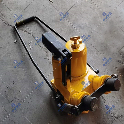 使用时先松开需改道作业部位前后4对以上轨道扣件,再将固定梁和齿梁通过中间的销轴联接成一体穿入两股钢轨底部。如果是缩小轨距,要将固定梁上外侧的挡块竖起靠在钢轨的外侧,再将液压工作机构底部的销轴卡在钢轨外侧齿梁的槽内,使液压工作机构的活塞顶头卡在钢轨外侧的底边上,关闭回油阀,揿动操作手把,在液压力的作用下就能将钢轨向内侧移动,使轨距达到要求;如果是加大轨距,则将固定梁上内侧的挡块竖起并靠边在钢轨的内侧,将液压工作机构安卡在另一股钢轨内侧齿梁的槽内。道岔的改道作业,需要改用道岔专用的支撑机构,作业方法同上。