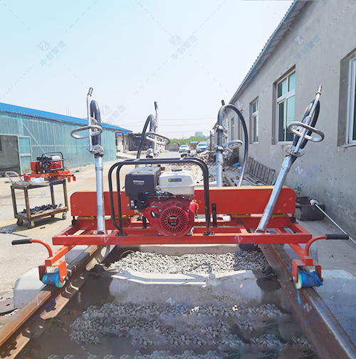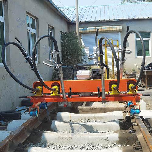 2、抬整机上道,将单走行轮抽出支撑管置于另一侧钢轨上,锁紧紧固螺钉。取下振捣棒将其前端对地轻轻磕碰;振捣棒发出“嗡……”的高频响声后即可使用。